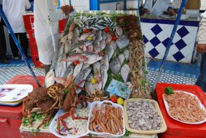 With the seafood no fresher anywhere in Morocco, we headed to the market. After picking out selections (Dorado, calamari and a huge crab), they were flavored simply with salt and thrown on the grill and served with a salad. Before: