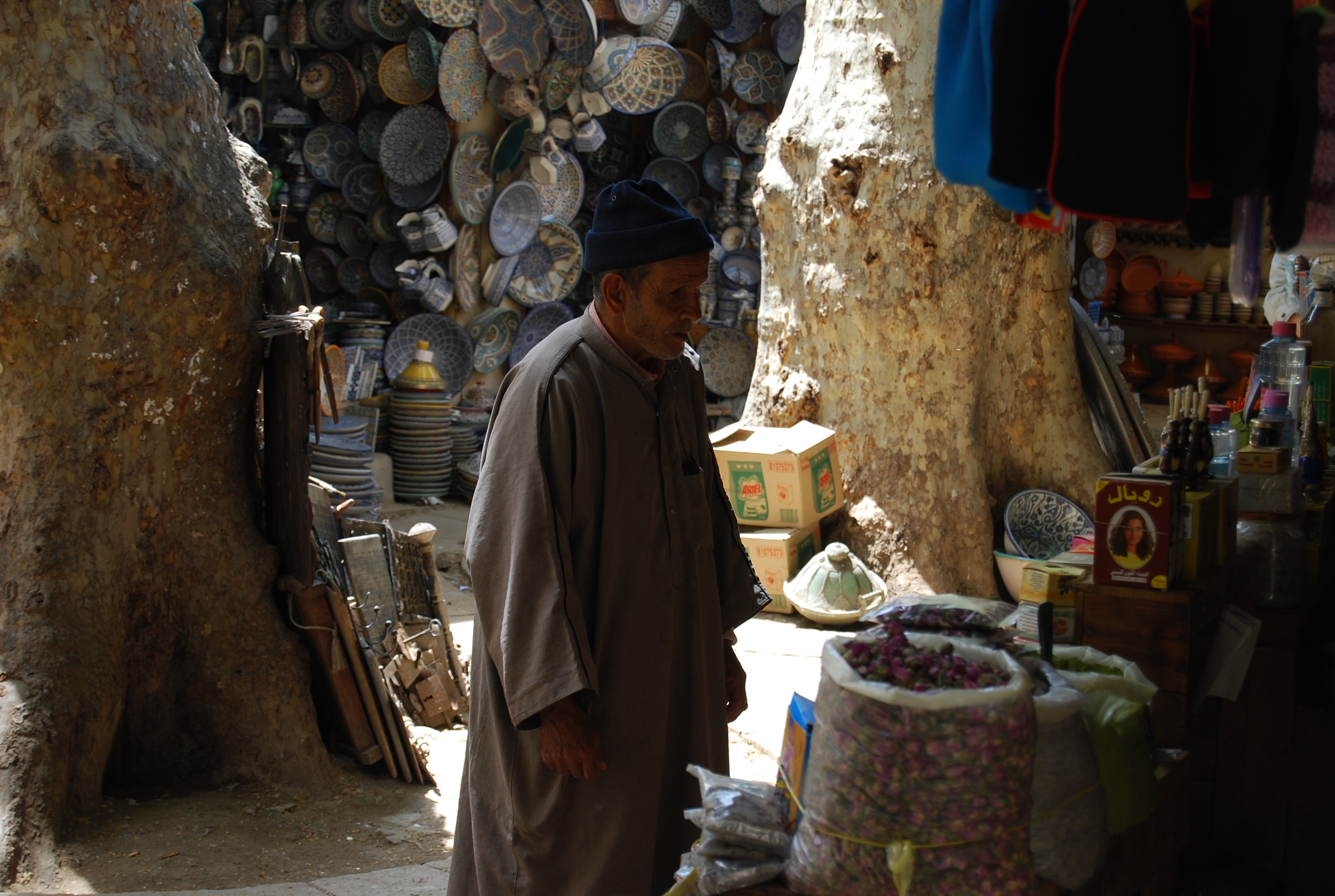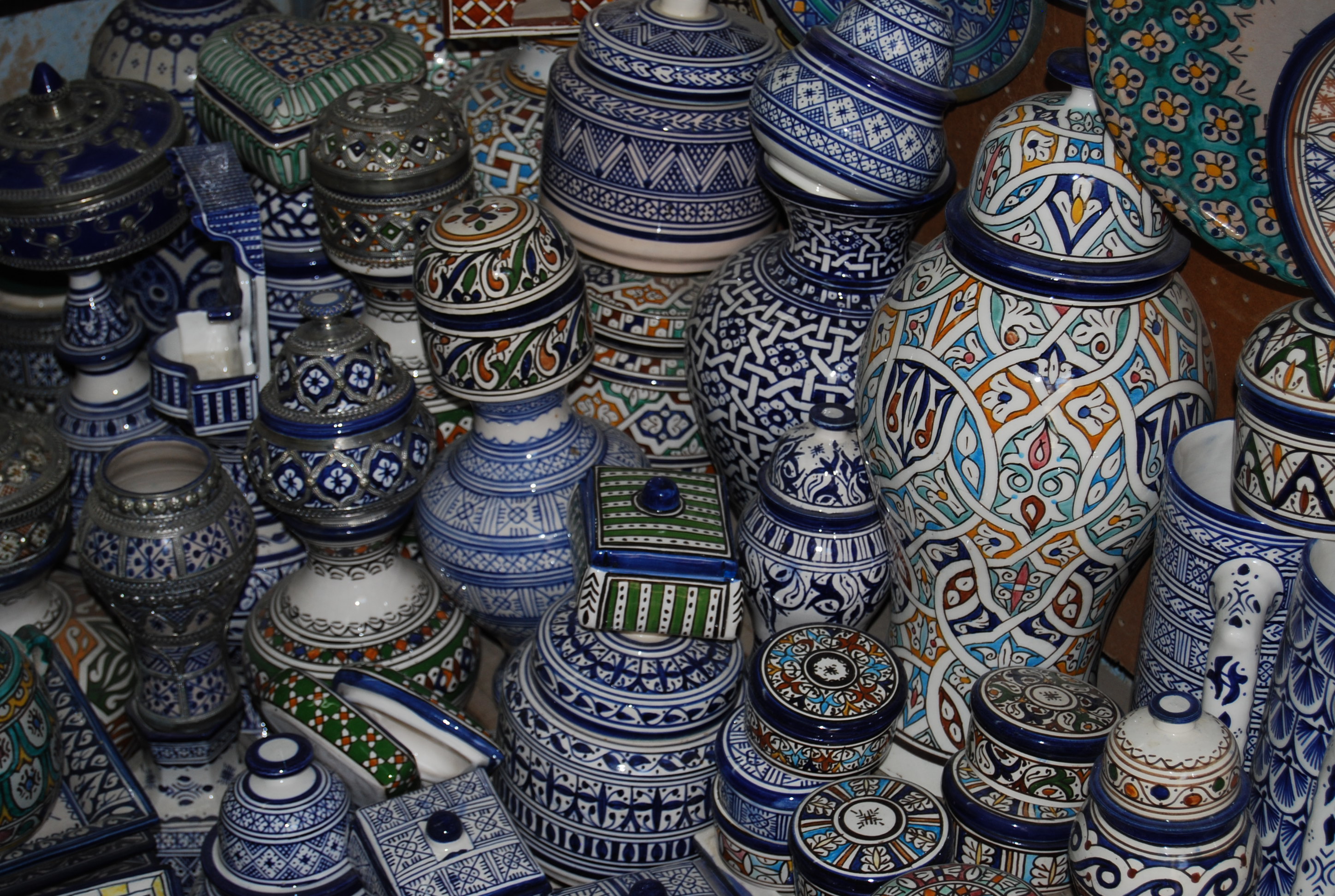 On a self-guided tour, we saw stalls of traditional blue and white pottery, worshippers at the Kairaouine Mosque & University (which claims to be the world’s oldest — take that Harvard!) and Fassis in the henna souq.