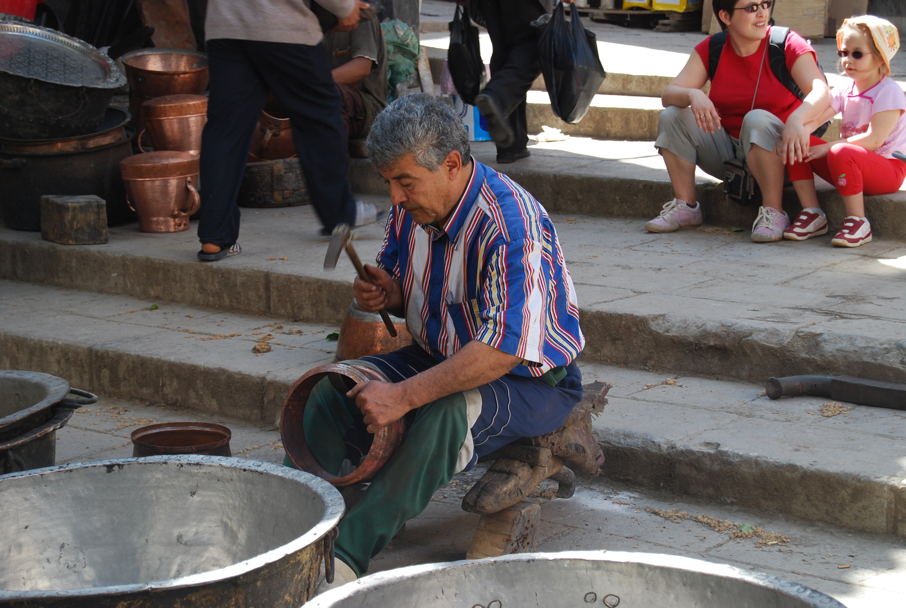 In a city so steeped in history, it’s not surprising that the Fassi people have clung to many of the traditions and practices developed in medieval times. Our riad, Dar Seffarine, is just a couple steps from Place as-Seffarine, where metalworkers shape bowls, pans and plates and the air rings out with the sound of hammers pounding metal. (Note: Tourists in photo background are not metalworkers.)