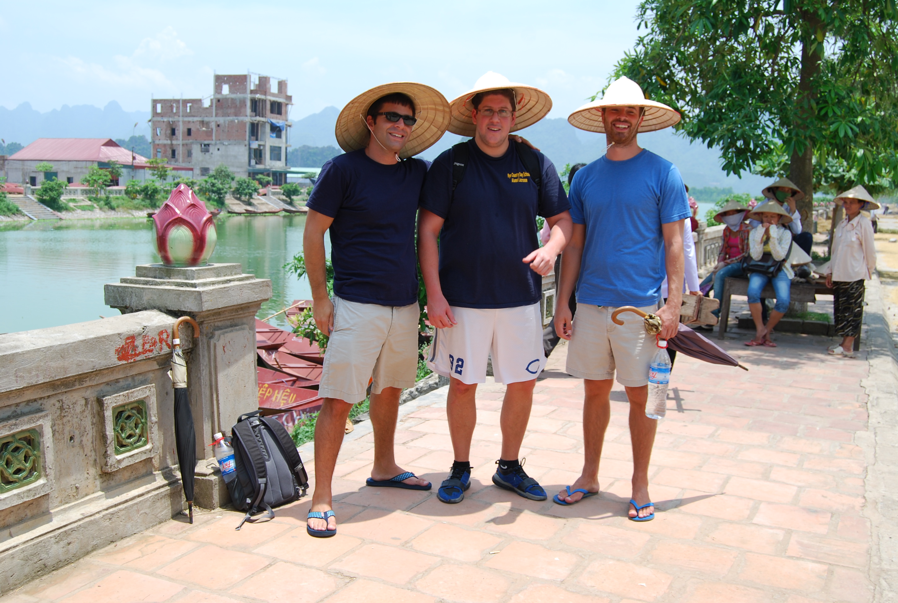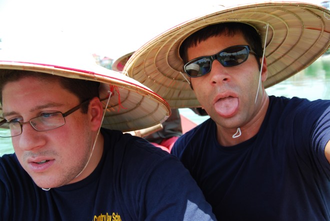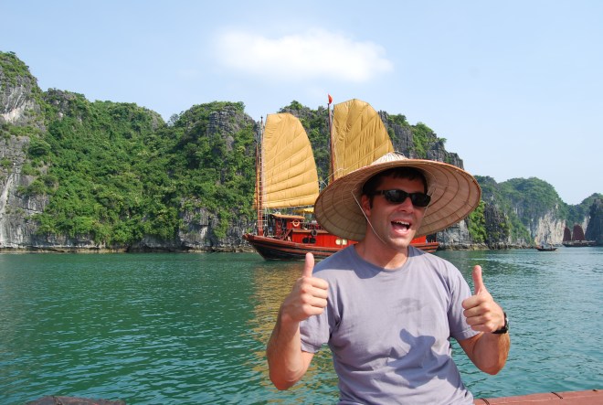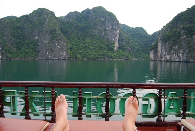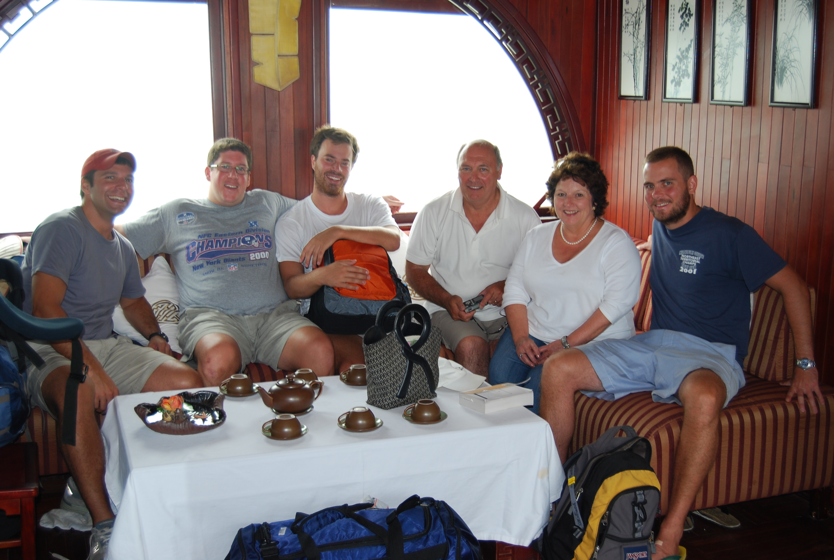 A 3-hour transfer, which included a stop at either an arts & crafts village or a sweat shop, brought us to Halong City, an overdeveloped eyesore, where we were quickly herded onto the boat. The crew welcomed us aboard the highly lacquered replica junk boat, at which time we realized that there were only four rooms, of which we would have three. The last was taken by a great Aussie couple — who actually didn’t seem to mind being with a bunch of young American guys.