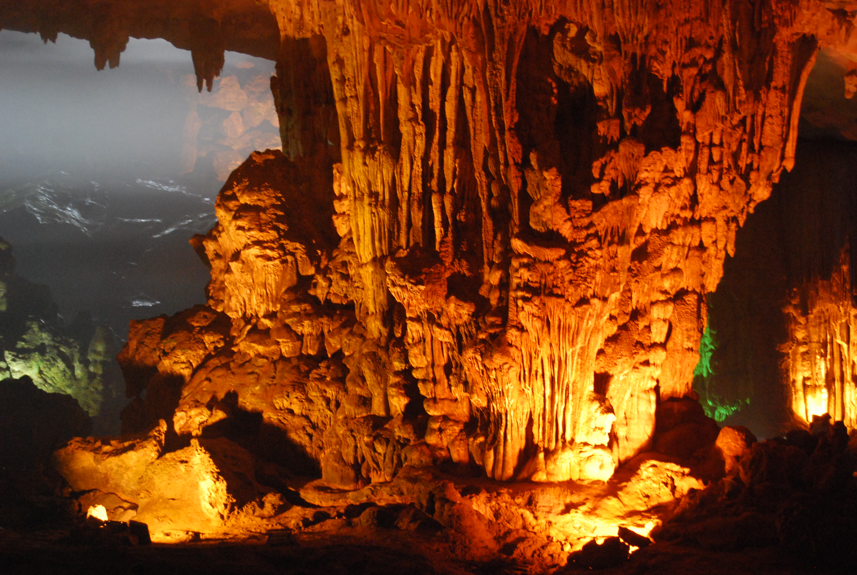 Our captain picked up anchor about an hour later — and although our boat was the only one in Halong Bay with working sails — cranked the engine to reach our next destination: Sung Sot Cave, on the island of Bo Hon. This is the largest and grandest of the many caves that dot the Gulf. This “Cave of Surprises” as it is known was a huge and cavernous spot, lit to accent its many defining features, and packed with day-tripping and screaming Vietnamese tourists to break the creepy silence.