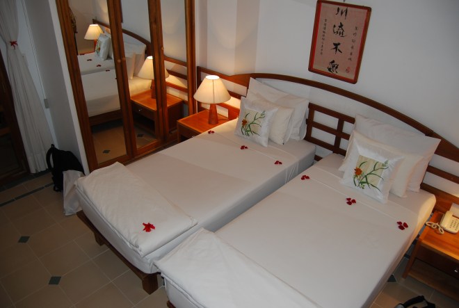 We pulled into the Ha An Hotel at around 10:30 p.m. and could immediately tell that this would be a nice place. The rooms, filled with fresh cut flowers, were immaculate and spacious — and the provided shampoo, clearly home-concocted and offered in little clay jars, worked wonders.