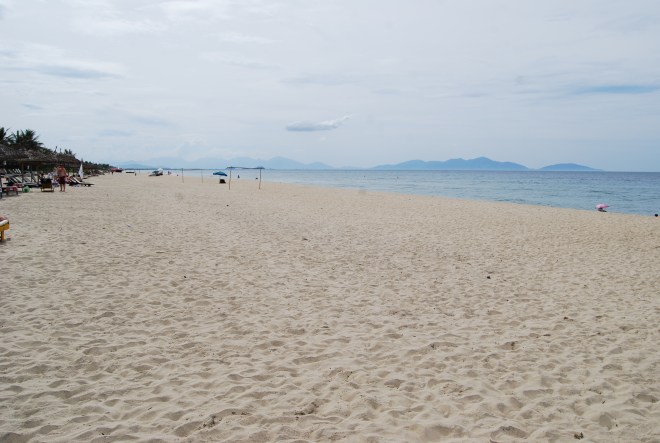 The town really heats up in the afternoon, so we retreated to our hotel for bathing suits and then hopped into a taxi to Cua Dai Beach, a beautiful stretch of sand on the South China Sea. This beach runs for miles north to Danang, where it’s known as China Beach, what was once a hang-out for American soldiers during the war. We paid for some beach chairs under a palm-thatch hut and took in the surroundings.