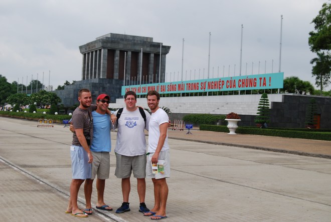 With humidity inching towards 100 percent, Hanoi was a complete swamp this morning. We couldn’t let that stop us from seeing the city though, so after all becoming millionaires (16,000 dong to $1USD exchange) we hired a guide and driver (with a well air-conditioned car) to show us around. Our first stop was the Ho Chi Minh Mausoleum Complex, which like Mao in Beijing, is considered a holy site. Vietnamese queue by the thousands to see Uncle Ho in his glass sarcophagus — except from September to December when his body is sent to Russia for “restoration.”