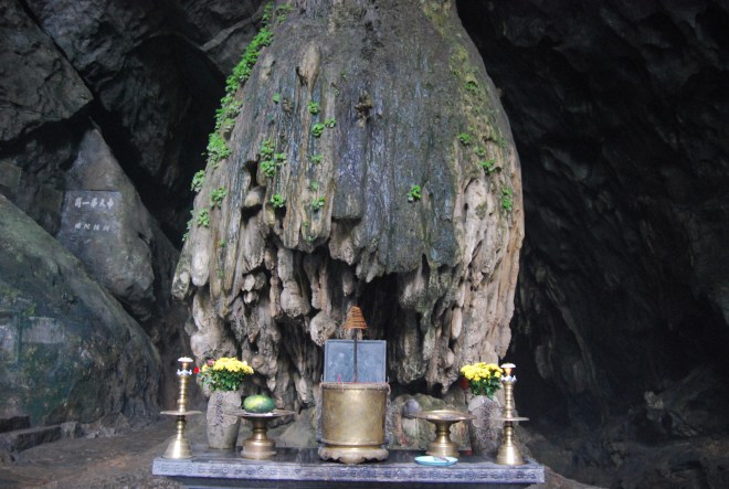 At the peak of Huong Tich was the most sacred temple of the Perfume Pagoda. It was built into a cave in the 15th century and is visited each January through March by millions of pilgrims. The cave was a remarkable place, and not just because it was so cool that you could see your breath. Zoom explained all the shrines to us and then invited us to rub a dollar bill on a special rock for prosperity and take one drop of water to our bodies for good health.