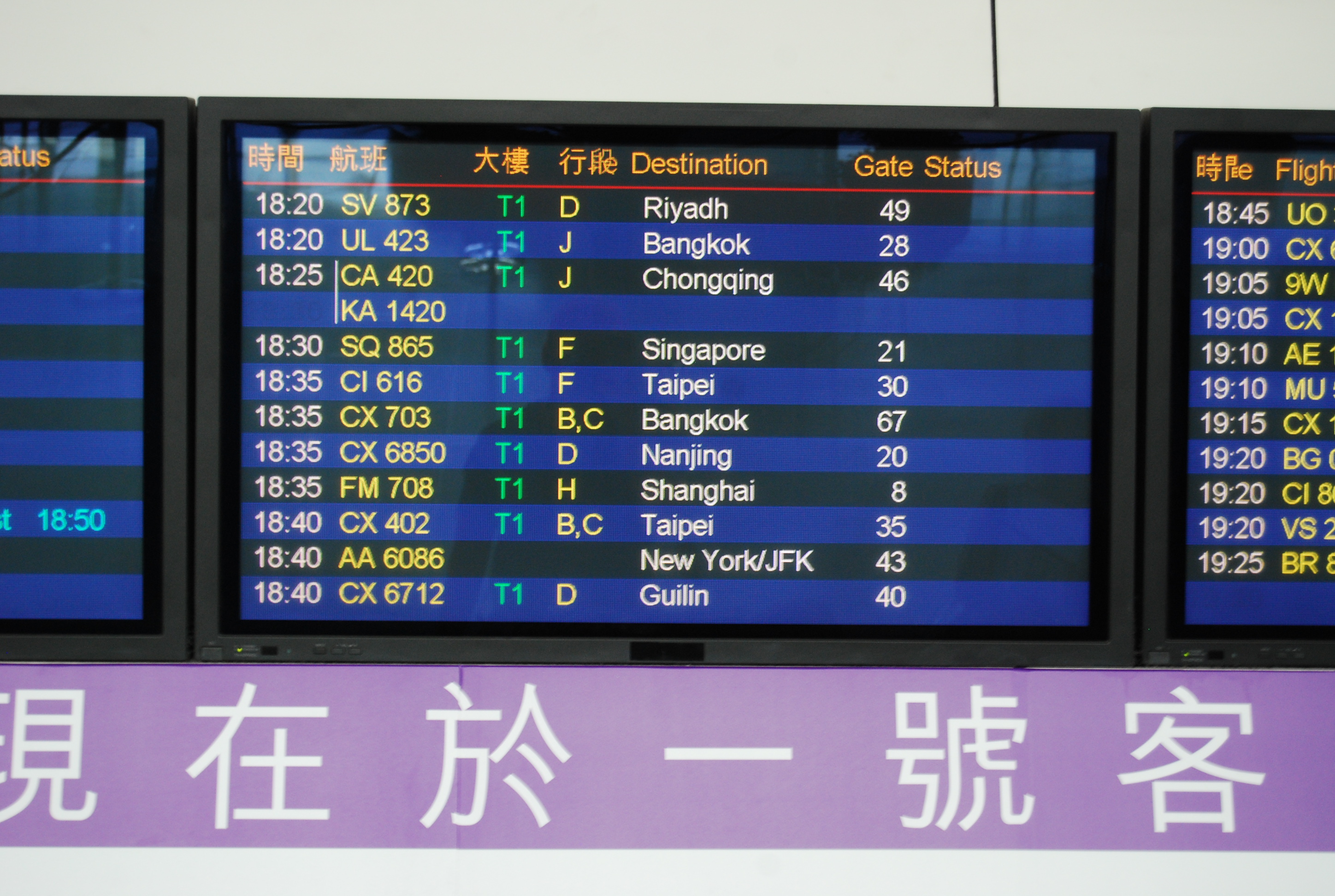 We overslept this morning and then had to race to the airport for our flight to Hong Kong. Our taxi driver kept his hand on the horn and did a formidable job of getting us there in about 25 minutes. The agents were still at their counters when we arrived — although they were wrapping up — so we checked our bags, passed through security and immigration and made our way to the gate.