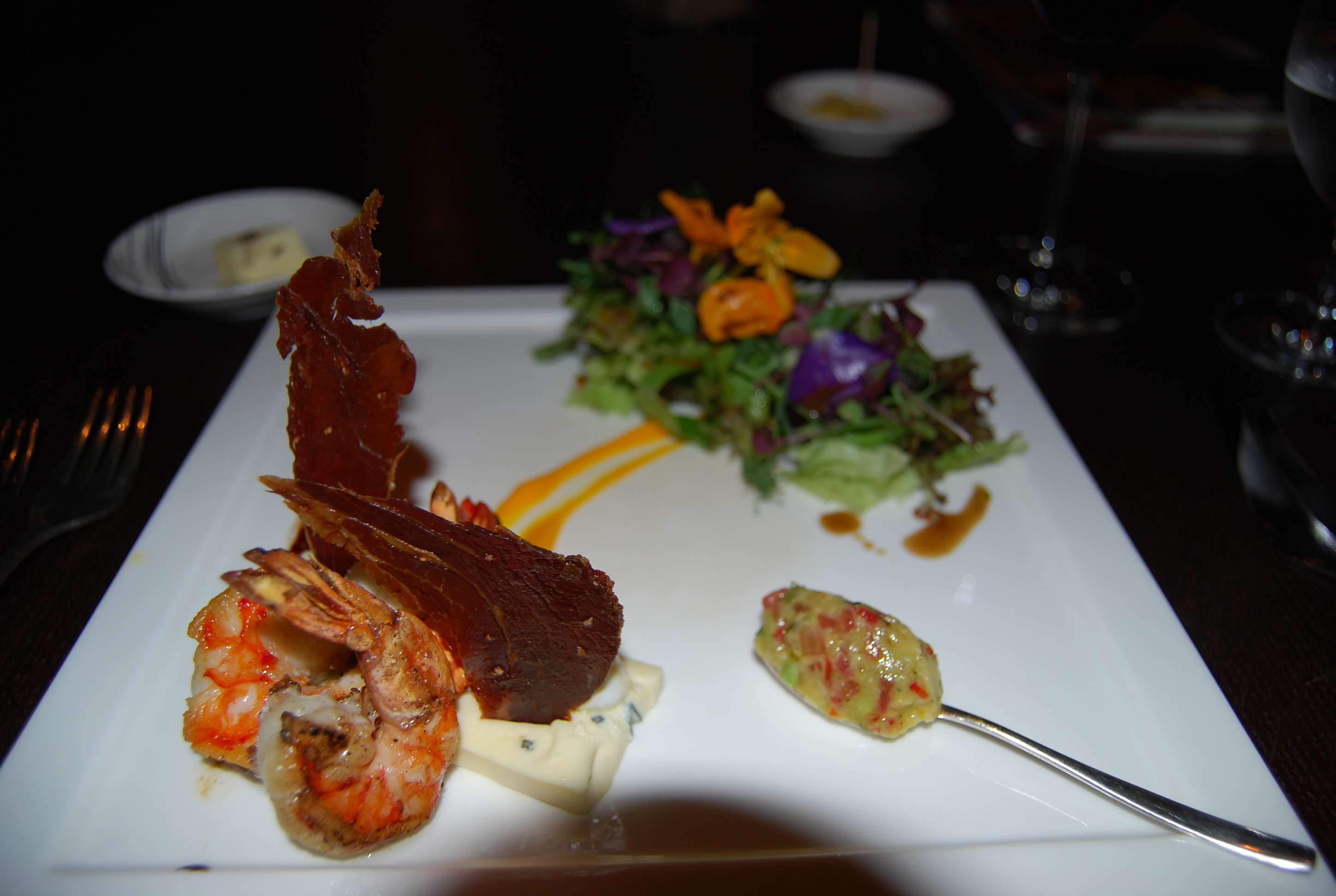 It started with a cobb salad with grilled prawns, Serrano ham, poached quail eggs and an avocado puree.