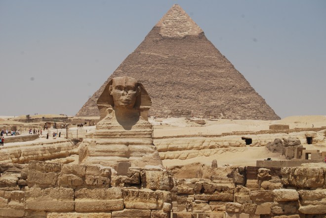 Our last stoop was the Sphinx — which was much smaller than I’d imagined. I’m not sure if that was because of expectations or because we had just finished touring the massive pyramids. It was no less amazing to see in person though, with the Khafre Pyramid looming behind it.